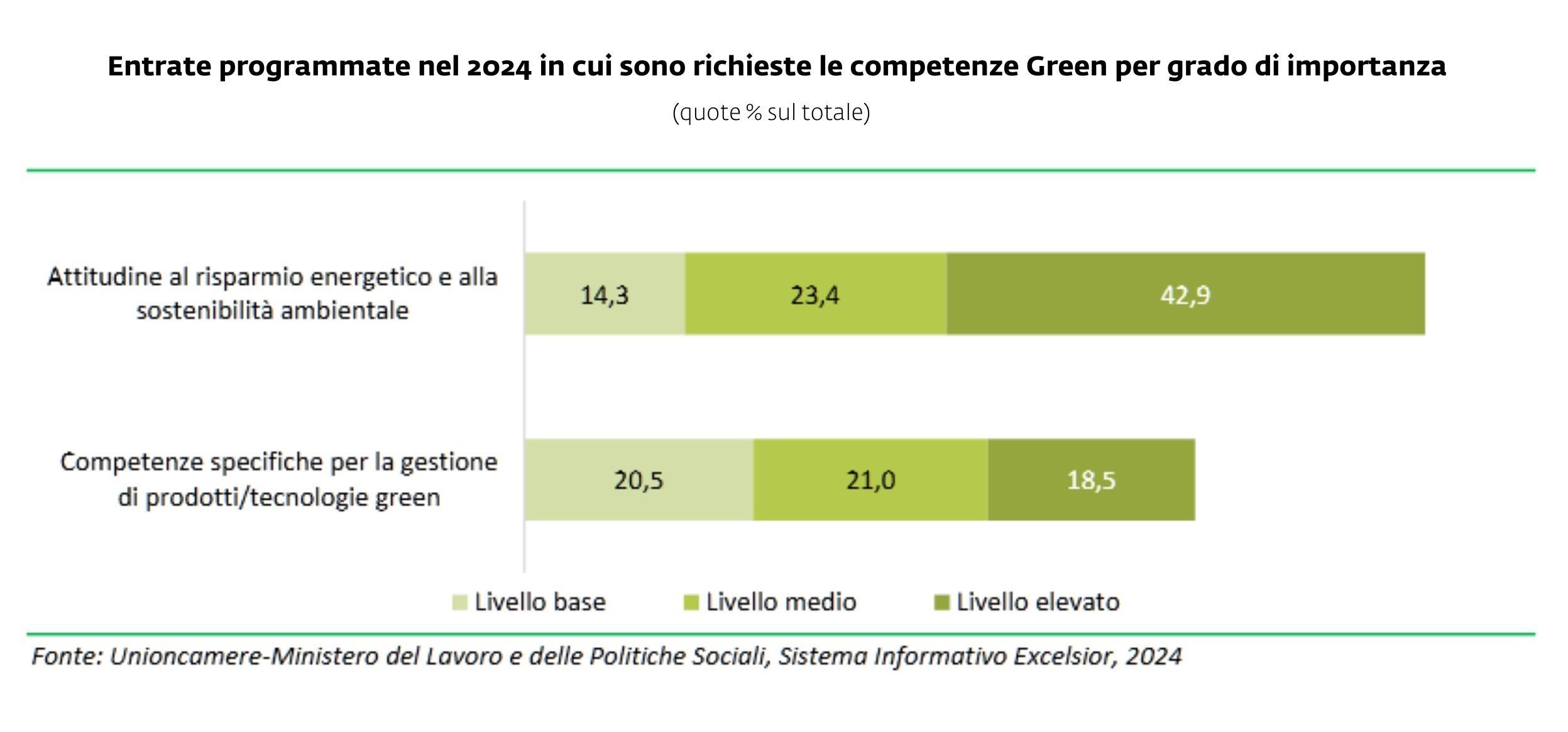 L’indagine Excelsior ha approfondito ulteriormente le competenze green richieste dalle imprese con un ulteriore quesito su “Competenze specifiche per la gestione di prodotti e tecnologie green” risultata necessaria per il 64% dei casi, che si aggiunge alla già presente “Attitudine al risparmio energetico e alla sostenibilità ambientale” gradita nell’81% dei casi, quasi imprescindibile per chi intende entrare nel mercato del lavoro; il sistema informativo fornisce inoltre dati complessivi sulle entrate programmate dalle imprese di 5.516.280 unità (+0,13% rispetto al 2023), mentre i Green jobs si attestano a 1.891.990 unità (-1,4% rispetto all’anno precedente), incidenza dei Green jobs sul totale delle entrate pari a 34,3% (-0,5 punti percentuali, lieve calo). Nell’industria l’incidenza dei Green jobs sul totale delle entrate si attesta al 69,5%, mentre nei servizi si attesta al 20,8%; nel dettaglio i principali settori per incidenza sono le costruzioni, con l’86,7% di Green jobs sul totale delle entrate programmate (primato confermato), le industrie di fabbricazione macchinari e attrezzature e dei mezzi di trasporto (85%), le industrie metallurgiche e dei prodotti in metallo (83,5%), le industrie della gomma e delle materie plastiche (81,8%), le industrie elettriche, elettroniche, ottiche e medicali (78,7%), le public utilities (76,7%) e le industrie chimiche, farmaceutiche e petrolifere (73,8%); nei servizi, invece, sono la logistica (73,5%), commercio all’ingrosso (62,0%), commercio e riparazione di autoveicoli e motocicli (60,1%), servizi avanzati di supporto alle imprese (51,8%), servizi informatici e delle telecomunicazioni (44,9%) e servizi finanziari e assicurativi (37,2%). Tra gli approfondimenti settoriali oltre all’edilizia e alla meccatronica è analizzato il turismo con entrate programmate per 1.167.630 unità: l’attitudine al risparmio energetico e alla sostenibilità ambientale è richiesta all’84% delle stesse, mentre le competenze specifiche per gestire prodotti e tecnologie green caratterizzano il 59% delle entrate; difficoltà di reperimento per oltre il 53% dei casi.